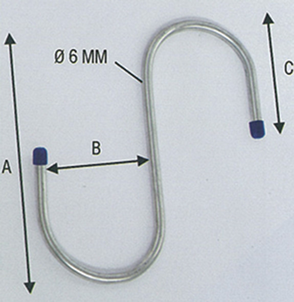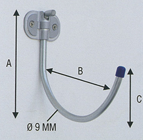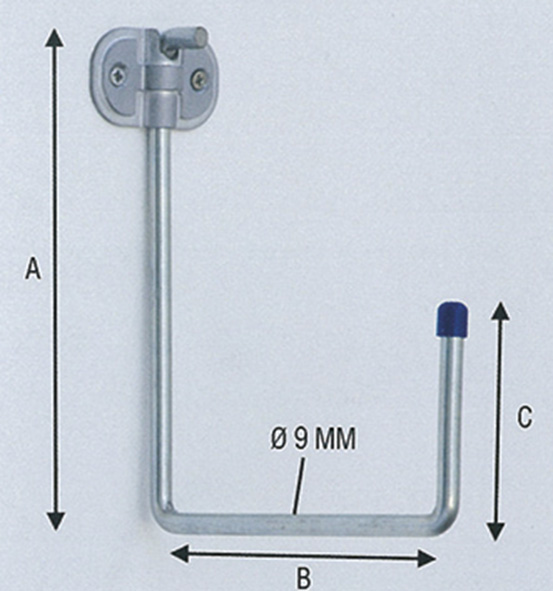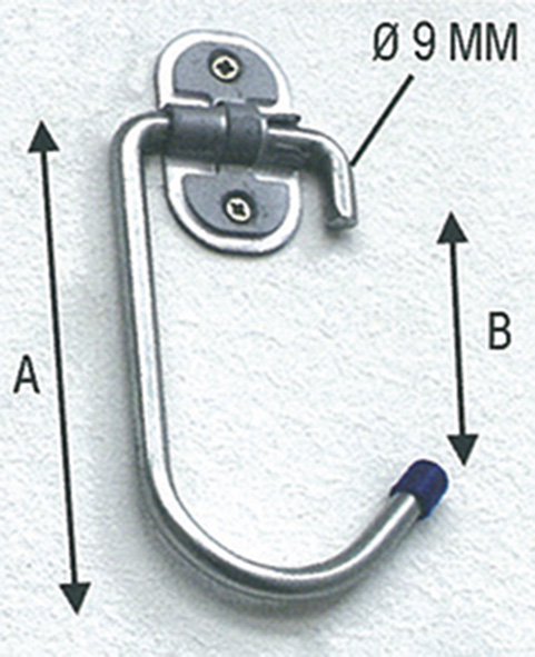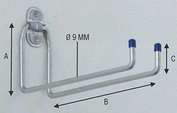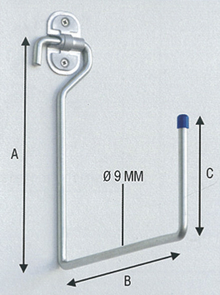 In acciaio zincato tondo pieno d.mm.9 con tappo in PVC azzurro. Piastra di supporto stampata e nervata, l'apposita cava viene utilizzata: in posizione di blocco di sicurezza o in posizione di riposo, quest'ultima elimina l'ingombro del gancio in assenza del carico. N.B. bobina di carta non inclusa.