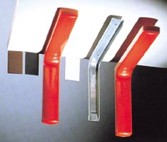 In acciaio zincato con coperture in plastica colorata. Confezione in elegante scatola multicolori self-service contenente 2 pezzi con maschera di foratura.