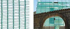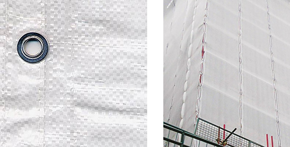 Fitta rete di protezione schermante in bandella HDPE, con asole alle cimose. Colore bianco. Elevate caratteristiche di resistenza alla rottura. Non ostacola il passaggio dell'aria. La disposizione delle bandelle permette di opporre minima resistenza al vento, senza causare il pericoloso effetto vela tipico dei prodotti a magliatura fitta.