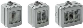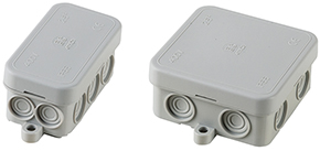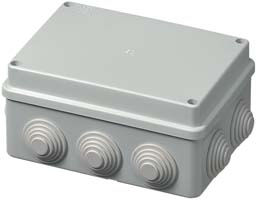 In ABS con passacavi concentrici in materiale morbido. Coperchio a pressione con chiusura a scatto.