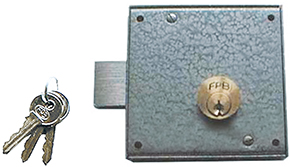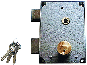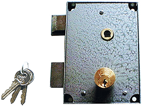 Serrature applicare per porte in ferro. Verniciate grigie. Catenaccio a due mandate. Cilindro d.mm.25, sporgenza lato esterno mm.11. Entrata mm.55. Scatola mm.100x100H. Cilindro ricambio ns.cod.839340. In dotazione 3 chiavi (ricambio ns.cod.880472).
