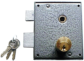 Serrature applicare per porte scorrevoli in ferro. Verniciate grigie. Il gancio ? comandato dalla maniglia e bloccato dalla chiave. Cilindro d.mm.25, sporgenza lato esterno mm.11. Entrata mm.55. Scatola mm.100x140H. Interasse quadro-cilindro mm.65. Quadro mm.8. Cilindro ricambio ns.cod.839340. In dotazione 3 chiavi (ricambio ns.cod.880472).