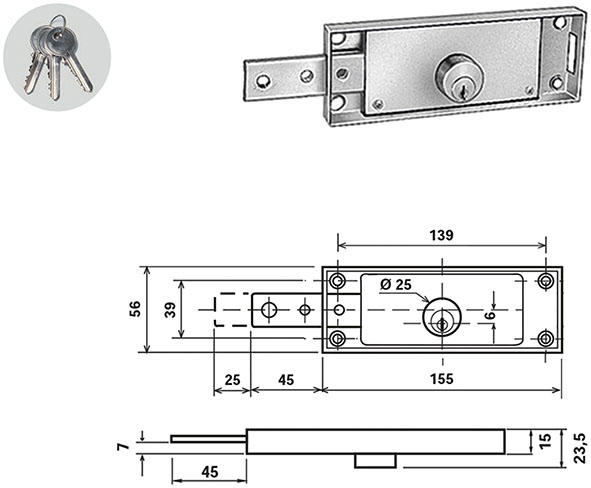 Serrature per serrande. Versione con 1 catenaccio diritto SINISTRO. Movimento ad ingranaggi. Cilindro tondo d.mm.25. Corsa aste mm.25. Foro aggancio aste mm.6. In dotazione 3 chiavi (ricambio ns.cod.880472).
