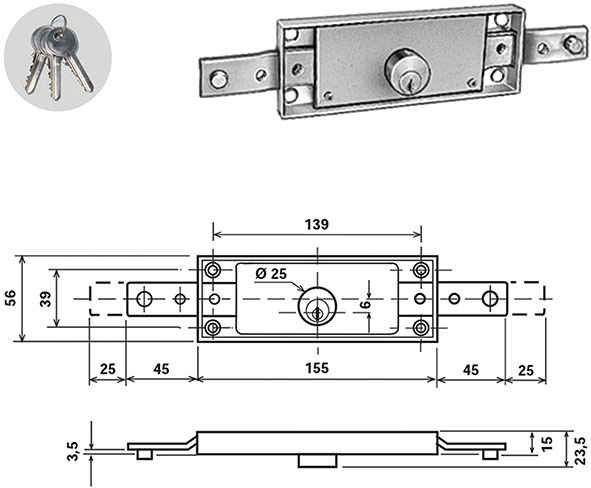 Serrature per serrande. Versione con 2 catenacci PIEGATI. Perni ribattuti. Movimento ad ingranaggi. Cilindro tondo d.mm.25. Corsa aste mm.25. In dotazione 3 chiavi (ricambio ns.cod.880472).