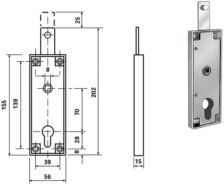 Serrature per porte basculanti. Movimento ad ingranaggi. Predisposte per cilindro europeo. Perni ribattuti. Quadro mm.8. Leva di sblocco dall'interno. Corsa aste mm.25. Fornite senza cilindro. Kit maniglie + placca ns.cod.596641.