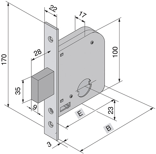 Serrature per cancelli e porte in ferro. In acciaio zincato. 2 mandate. Catenaccio mm.28. Predisposta per cilindro ns.cod.860370 non in dotazione.