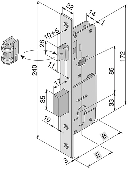 Serrature da montante. Catenaccio ad 1 mandata maggiorata mm.17. Frontale in acciaio nichelato con bordo quadro. E' possibile sostituire lo scrocco con il rullo regolabile ns.cod.860307 (da ordinare separatamente).
