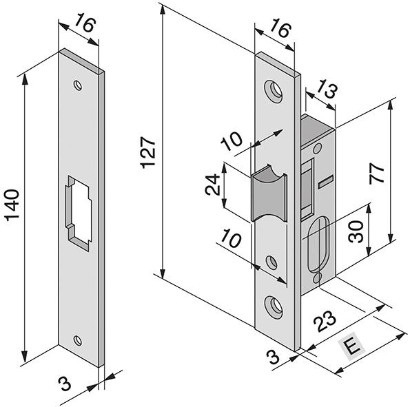 Serrature da montante. Scrocco reversibile. Frontale in acciaio nichelato con bordo quadro. Incontro in dotazione. Predisposta per cilindro ns.cod.860380 non in dotazione.