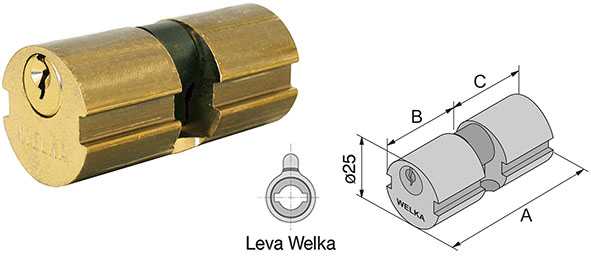Cilindri tondi da infilare diametro mm.25. Leva WELKA. Finitura ottone. Per serrature art.054, 055, 071, 073, 075. In dotazione 3 chiavi (ricambio ns.cod.880892 o 880058).