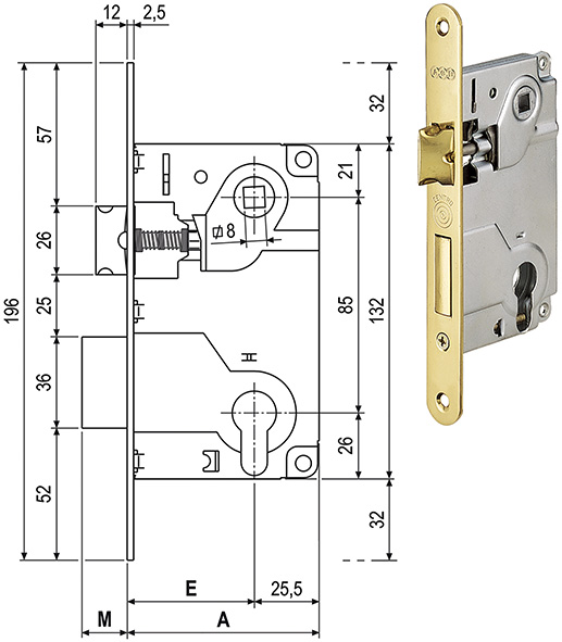 Serratura infilare con scrocco e catenaccio, da abbinare a cilindro sagomato. Interasse mm.85. Frontale mm.22 con bordo tondo. Scrocco reversibile. Azionando in apertura il cilindro con la chiave si movimenta lo scrocco. Per girare lo scrocco: sollevare la levetta di blocco, spingerlo all'interno della serratura e ruotare. Da abbinare: incontri AGB CENTRO frontale 22 ns.cod.860787-860788-860789.