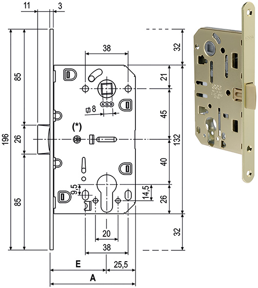 Serratura a CILINDRO infilare a scrocco centrale in nylon indeformabile per maggiore resistenza e silenziosit?. Lo scrocco funge da catenaccio. La chiave blocca lo scrocco lasciando libera la maniglia. Frontale mm.18 bordo tondo. Interasse mm.85. Per girare lo scrocco, spingere con un cacciavite nel foro lato serratura. Contemporaneamente estrarre lo scrocco e girarlo.