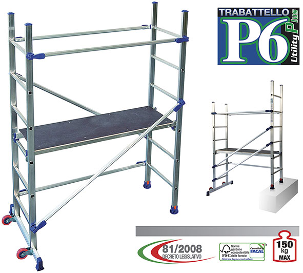 Trabattello domestico tutto in alluminio di rapido montaggio, reso particolarmente solido e compatto dalle leve Pinna ad espansione. Piano di lavoro cm.125x41 con ganci anti-ribaltamento. Alla base: barra stabilizzatrice con ruote inattive e due appoggi antiscivolo a densit? composta. Posizione zoppa per scale e falsi piani. Peso kg.14,6. Portata max kg.150. H.max lavoro mt.2,90.