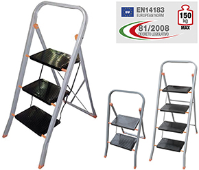 Sgabelli in acciaio, tubolare mm.20x15. Gradini acciaio neri cm.20x30. Plastiche arancio. Minimo ingombro solo cm.3,5. Conformi alla normativa europea EN 14183 D.lgs 81/2008. Portata max kg.150.
