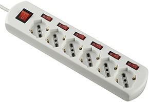 6 prese bipasso + schuko 2P+T 16A. 230V. Cavo mt.1,5 sezione 3x1. Spina 16A. Interruttore luminoso + 6 interruttori indipendenti per comandare ogni singola presa.