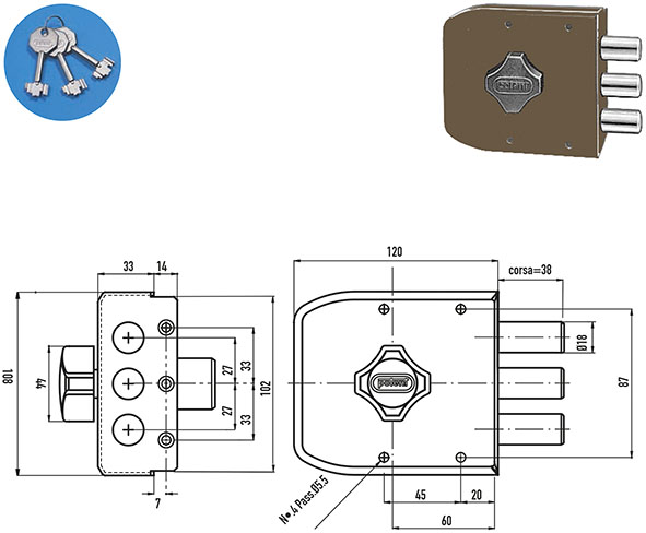 Serratura laterale da applicare. 3 catenacci. Entrata mm.60. Apertura interna con POMOLO. Esterno cilindro a pompa mm.50. In dotazione 3 chiavi (ricambio ns.cod.596637) e mostrina cromata.