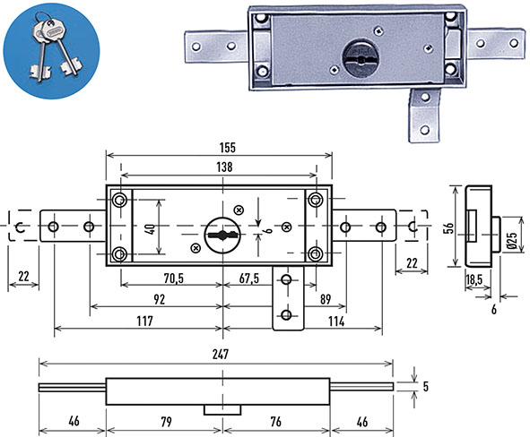 Serrature doppia mappa 6 gorges a 2 mandate. Versione TRIPLICE. Boccola guida chiave esterna integrata. Movimentazione con chiave sia dall'esteno che dall'interno. In dotazione 2 chiavi (ricambio ns.cod.596636).