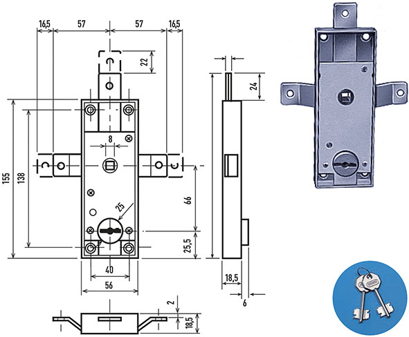 Serrature doppia mappa 6 gorges a 2 mandate. Versione TRIPLICE. Quadro maniglia mm.8. Boccola guida chiave esterna integrata. Movimentazione con chiave sia dall'esteno che dall'interno. In dotazione 2 chiavi (ricambio ns.cod.596636). Kit maniglie + placca ns.cod.596644.