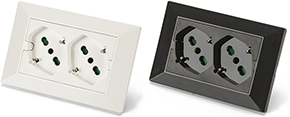 Prese a parete da incasso con 2 prese bipasso/schuko 2P+T 16A. Per scatole tipo 503 a 3 moduli. Precablate, cablaggio rapido. Universali. Non necessitano di adattatori civili che aumentano l'ingombro delle placche negli arredi. Mantengono ordine nei collegamenti e semplificano il cablaggio eliminando scomodi ponticelli tra le prese.