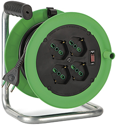 Tamburo d.mm.195. 4 prese 2P+T 16A. 250V Bipasso-Schuko. Spina 2P+T 10A. 250V. Interruttore luminoso termico di sicurezza.