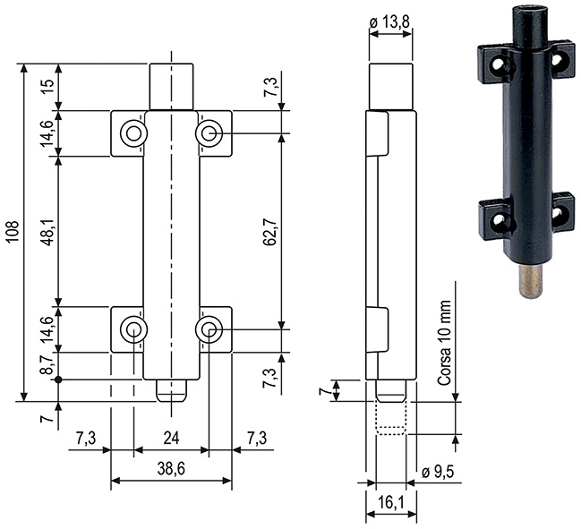 Chiusura verticale terminale, destra o sinistra, con puntale. In acciaio finitura nero. Permette la chiusura ad espansione sugli appositi pozzetti quando si voglia evitare la presenza dei perni di chiusura sporgenti. Il puntale esce completamente con una rotazione dell'asta di 90?.
