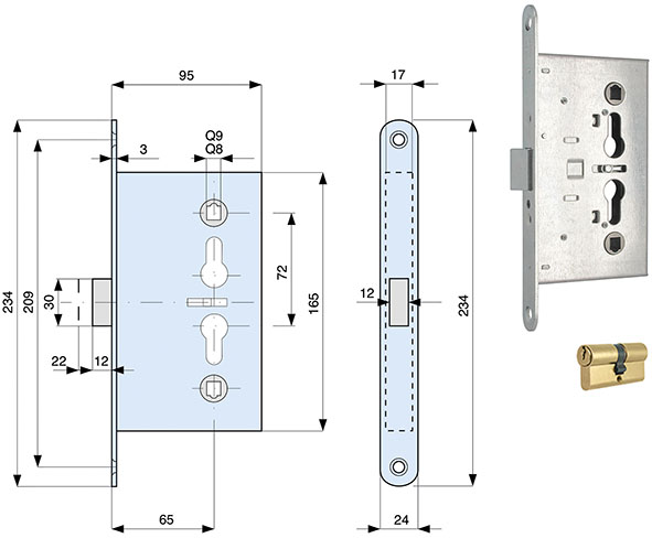 Serrature per porte tagliafuoco. 1 mandata e scrocco. Catenaccio in acciaio zincato. Frontale in acciaio zincato mm.24. In dotazione cilindro profilo europeo MG 015560 ns.cod.839240. Versione quadro mm.8 abbinabile a maniglia ns.cod. 652022, versione quadro mm.9 abbinabile a maniglia ns.cod. 652048.