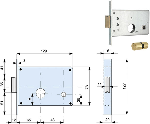 Serrature da infilare a cilindro per fasce. 1 mandata e scrocco. Catenaccio in ottone. Frontale in acciaio zincato mm.20. Quadro maniglia mm.8. In dotazione cilindro doppio tondo a sfilare d.mm.26 MG 019560 ns.cod.839241.