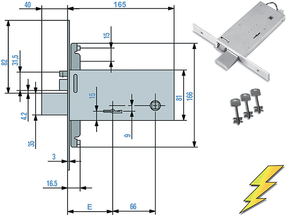 Elettroserrature TRIPLICI a doppia mappa, per fasce. 4 mandate. Catenaccio e scrocco. Quadro maniglia mm.8. Frontale INOX. Altezza scatola mm.81. Con 3 chiavi (chiave grezza ricambio ns.cod.882260).