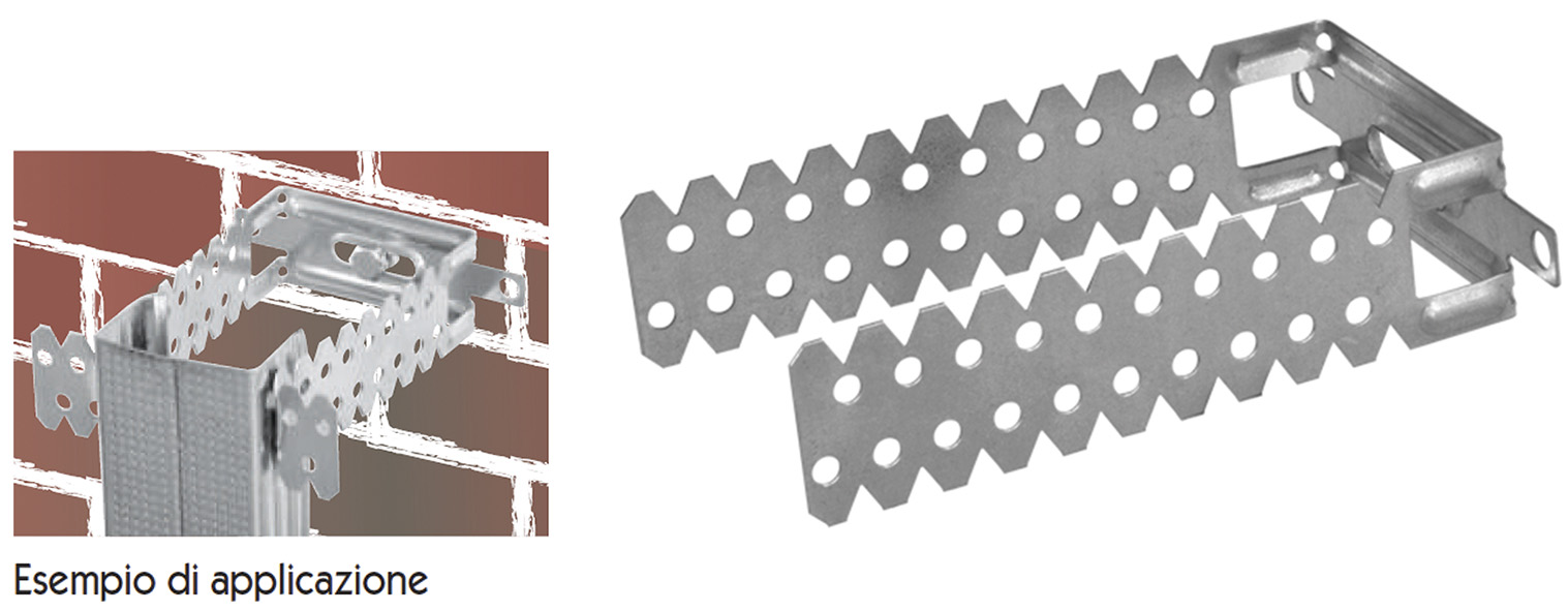 Staffa registrabile in acciaio zincato. Spessore da mm.0,8 a mm.1. Fori arrotondati e ovali che garantiscono un montaggio solido attraverso viti autofilettanti e autoperforanti. Utilizzata per l'ancoraggio dei profili di cartongesso sia verticale, orizzontale o inclinata.