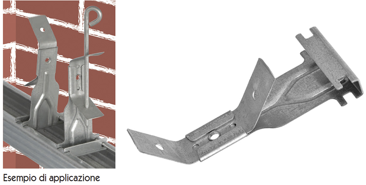 In acciaio zincato con molla, bordo arrotondato. Per montaggio di profili in acciaio per cartongesso da 50 in struttura per controsoffitti. L'inserimento nell'orditura metallica avviene per rotazione orizzontale, posizionando la sospensione all'interno della C del profilato.