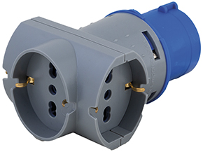 Adattatore da spina 2P+T 16A 230V CEE industriale a 3 prese schuko bipasso 10/16A 230V. IP20. Conforme alla normativa CEI EN 50250:2003 + a1:2015.