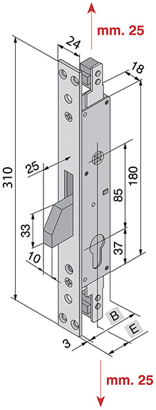 Serrature da montante TRIPLICI. Entrata MM.25. Corsa aste MM.25. Catenaccio basculante ad una mandata. Aste interne comandate dal quadro maniglia mm.8 e bloccaggio con cilindro. Aste attacco M8. Frontale in acciaio nichelato con bordo quadro. Predisposta per cilindro sagomato LEVA DIN (non in dotazione).
