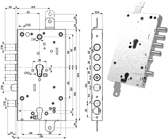 Serratura triplice DOPPIO cilindro. Ad INGRANAGGI. Reversibile. Per cilindro europeo, non in dotazione, da ordinare a parte. Attacco cilindro unificato. Blocco antieffrazione e rinforzo catenacci. ENTRATA MM.63. Serratura superiore 4 catenacci e scrocco. Quadro mm.8. Serratura inferiore comanda chiavistello e scrocco. Tramite una vite le due serrature possono essere rese dipendenti o indipendenti.