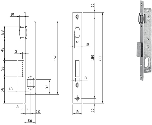 Serrature per montanti. 1 mandata. Catenaccio e RULLO. Frontale cromato. Quadro maniglia mm.8. Predisposte per cilindro ovale. Contropiastra non compresa.