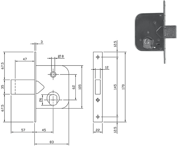 Serrature per cancelli. Catenaccio prolungato e scrocco incorporato. Richiamo scrocco con chiave o quadro maniglia mm.8. Una mandata da mm.10. Frontale in acciaio tropicalizzato mm.22x170. In dotazione cilindro art.842028287 ns.cod.848948. Con 3 chiavi art.020259 (grezzo ns.cod.848809).