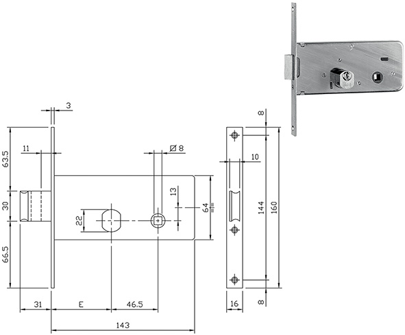 Catenaccio con scrocco incorporato. Richiamo scrocco con chiave o quadro maniglia mm.8. Due mandate da mm.10. Frontale in acciaio zincato mm.16x160. In dotazione cilindro art.840027277 ns.cod.848945. Con 3 chiavi art.020159 (grezzo ns.cod.848808).