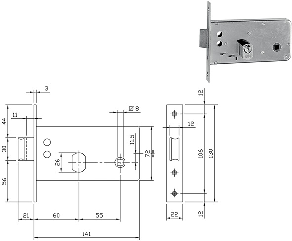 Catenaccio con scrocco incorporato. Richiamo scrocco con chiave o quadro maniglia mm.8. Una mandata da mm.11. Frontale in acciaio zincato mm.22x130. In dotazione cilindro art.842028287 ns.cod.848948. Con 3 chiavi art.020259 (grezzo ns.cod.848809).