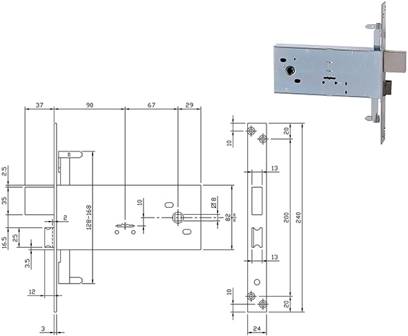 Serrature TRIPLICI per ferro infilare doppia mappa. 4 MANDATE. Catenaccio e scrocco reversibile. Richiamo scrocco con quadro maniglia mm.8 o chiave. Frontale zincato 25x240. Reversibile. Contropiastra NON compresa. Con 2 chiavi art.990802 (grezzo ns.cod.882284).