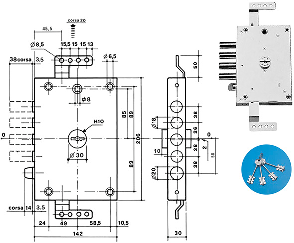 Serratura triplice doppia mappa per porte blindate. 4 mandate. Entrata mm.73. Q mm.8. 4 catenacci e scrocco. Catenacci corsa mm.38. Attacco aste regolabile con 3 fori ad interassi di mm.15. In dotazione 4 chiavi art.1815 (ricambio ns.cod.596629) + 1 chiave di servizio per il mezzo giro.