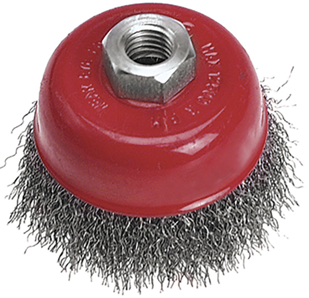 Spazzola metallica con fili ondulati in acciaio. In confezione blister. Foro d.M14.