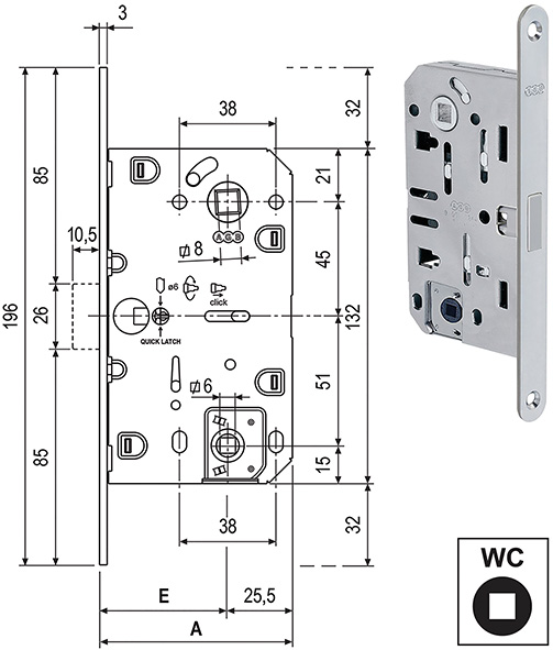 Serratura BAGNO infilare con scrocco centrale MAGNETICO. Lo scrocco funge da catenaccio. Il pomolo blocca lo scrocco lasciando libera la maniglia. Frontale mm.18x196 bordo tondo. Quadro-pomolo da mm.6. Interasse mm.96. Ambidestra. In dotazione 1 chiave patent. Da abbinare a contropiastra ns.cod.861146 e vaschetta ns.cod.861143.
