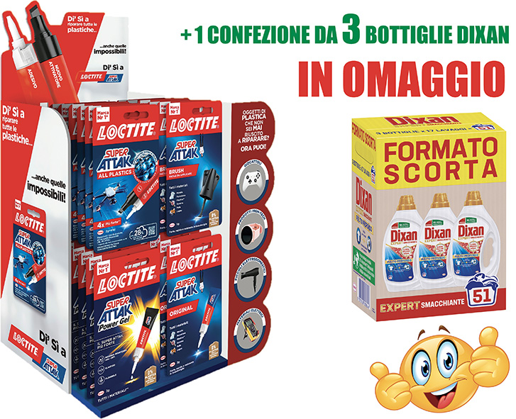Espositore misto 36 blister colla super attak: 6 bli. ALL PLASTICS (2gr+4ml), 18 bli. ORIGINAL (3gr), 6 bli. POWER GEL (3gr), 6 bli. BRUSH (5gr). Dimensioni cm.31x25x52H.