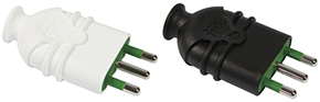 Professionali. Corpo in tecnopolimero ad alta resistenza al calore ed agli urti. Spinotti allineati a pettine in ottone nichelato. Passacavo integrato sul corpo.