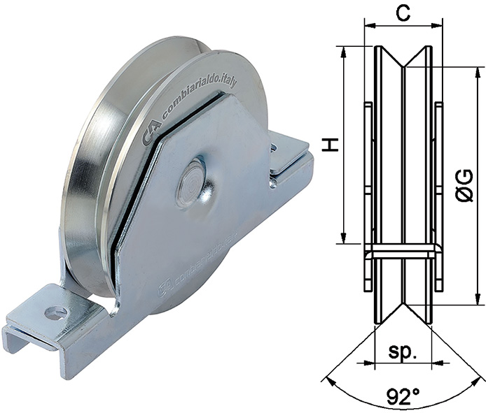 Ruota 1 cuscinetto gola V supporto interno. Zincata. Per cancelli scorrevoli.