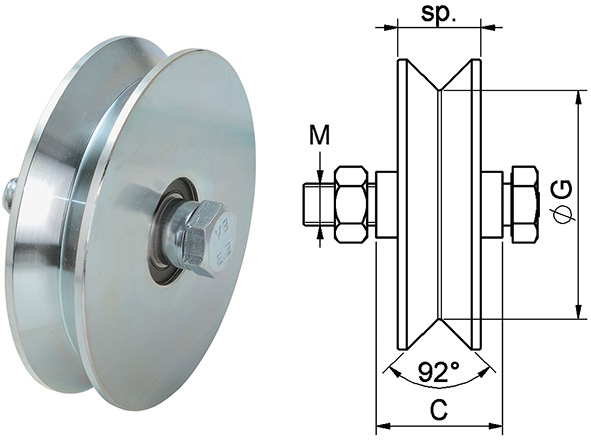 Ruota 2 cuscinetti gola V. Zincata. Per cancelli scorrevoli.