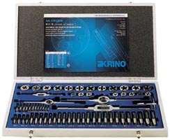 Assortimento a filettare per garage. Maschi in serie 2 pz. filiere tonde e girautensili. Filettatura metrica a passo grosso e fine. Assortimento completo di: 20 serie maschi da 2 pz. - 20 filiere - 2 pz. girafiliere - 3 pz. giramaschi. In cassetta.