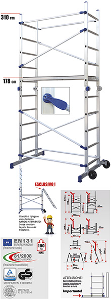 Conformi alla normativa europea EN 131. Portata max kg.150. I fianchi si ripiegano verso l'esterno. Trasformabile in 2 scale a forbice o in 2 scale semplici d'appoggio. Base cm.114x156. Piano di lavoro cm.51x143 in alluminio e legno antiscivolo idroresistente. Montanti mm.24x60. Pioli mm.30x30. Forti ganci di ancoraggio saldati al pianale. 2 ruote. Peso Kg.34,5.