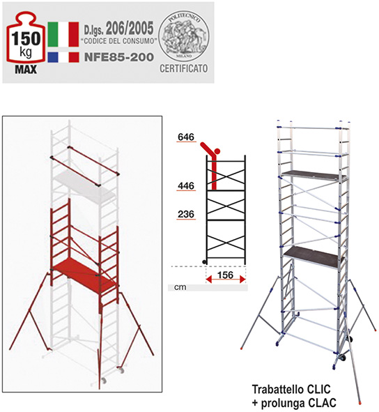 Il trabattello PINNA CLIC a 2 alzate con un'altezza di mt.3,65 pu? estendersi a 3 alzate con un'altezza di mt.5,73 con l'aggiunta della prolunga CLAC di mt.2,08 con 7 gradini. La prolunga comprende 4 stabilizzatori automatici, 1 piano.