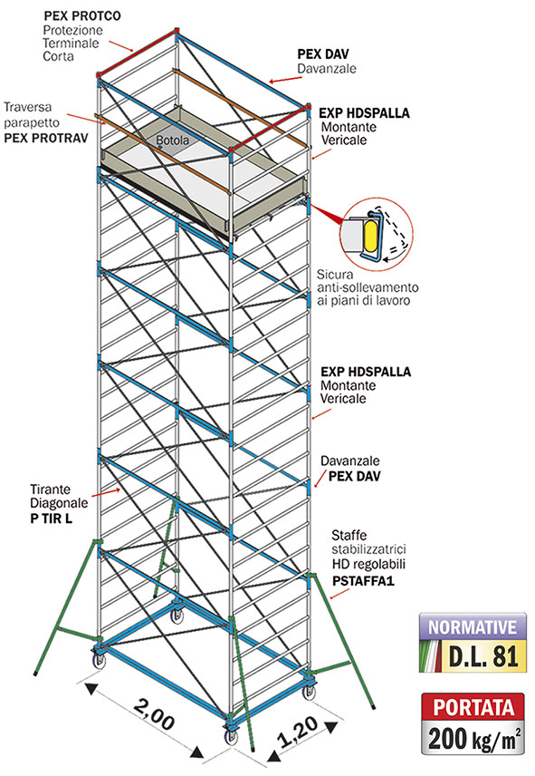 Portata 200 kg/mq. Base mt.2,00x1,20. Campate H.mt.1,20. Gradini sez. rettangolare mm.40x20 distanziati ogni 30cm. Tubo in profilo d'acciaio d.mm.45x1,5. Zincatura anti-ruggine alta densit?. 4 ruote nylon c/freno d.mm.200. 4 staffe stabilizzatrici. Stabilizzatori a vite non compresi. Per normativa EN1004-1 vedere tabella. Le misure 10,05, 11,25, 12,45 se usate in esterno necessitano ancoraggio.
