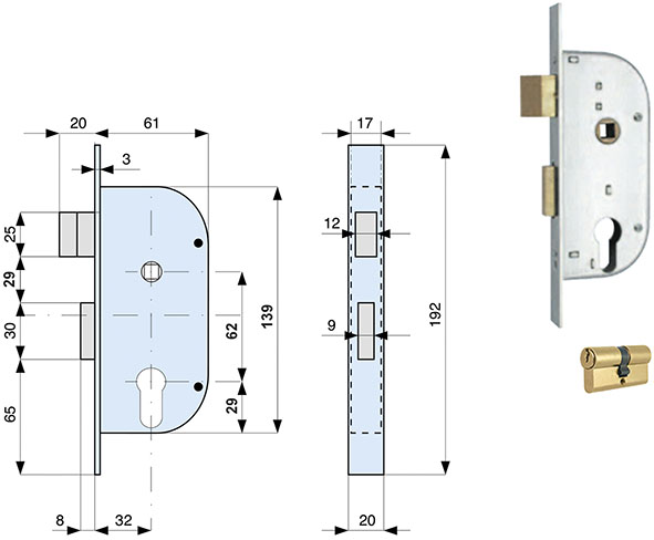 Serrature da infilare a cilindro per cancelli. 2 mandate e scrocco. Catenacci in ottone. Reversibili. Frontale in acciaio zincato mm.20. Quadro maniglia mm.8. In dotazione cilindro profilo europeo MG 015560 ns.cod.839240.