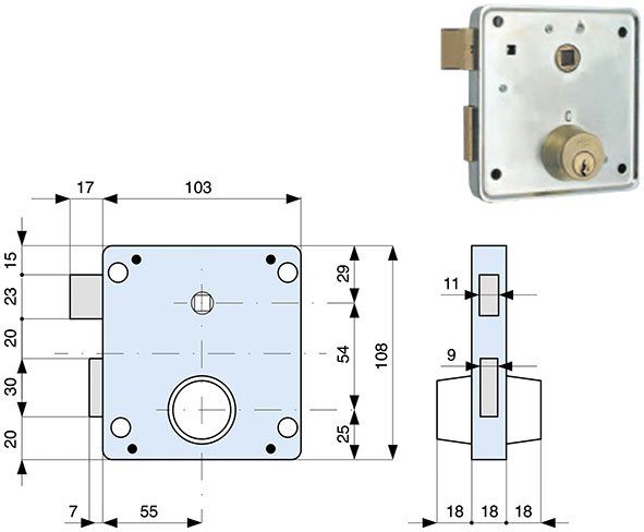 Serrature da applicare quadre tipo Torino per cancelletti. 2 mandate e scrocco reversibile. Catenacci in ottone. Quadro maniglia mm.8. In dotazione cilindro doppio tondo fisso MG 013200 ns.cod.839219.